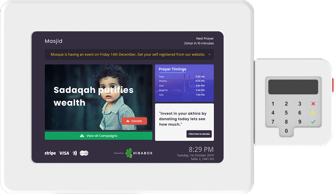 A multi-feature contactless Self-service Donation and Registration Kiosk, specifically built for the mosques and Islamic centres, enabling them to run customised campaigns, pledges, fundraising events, programs and accept donations quickly and simply. Learn More